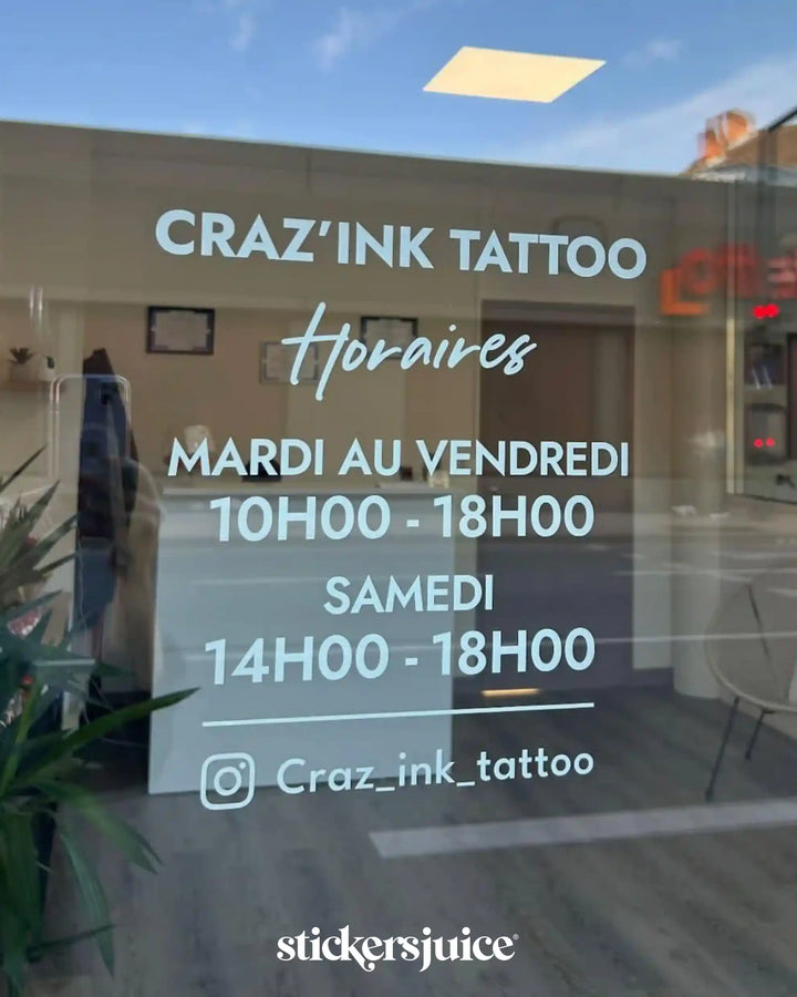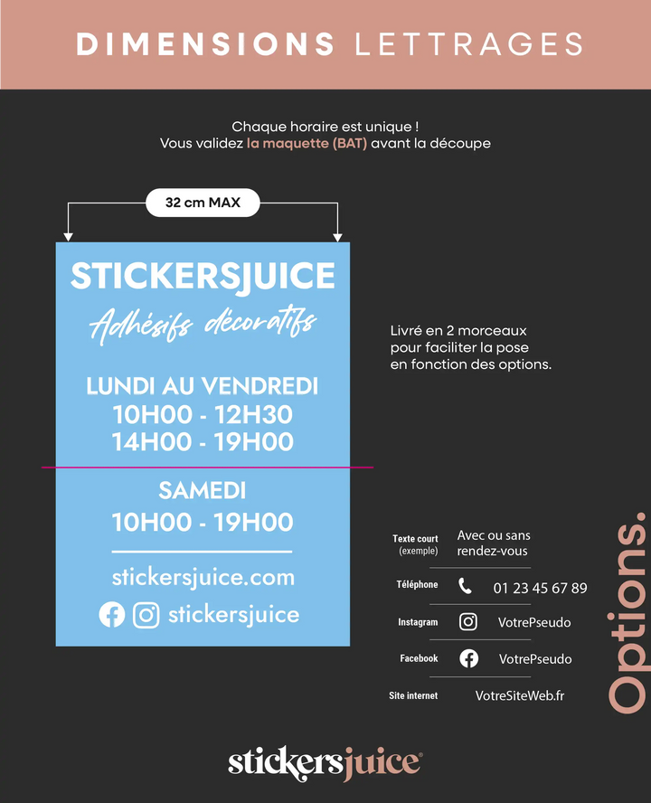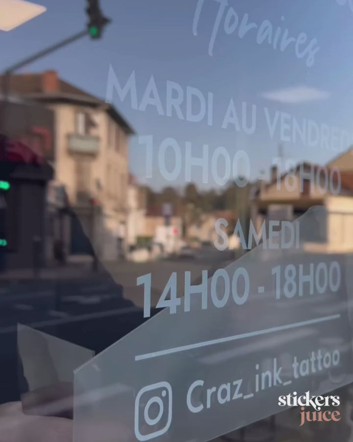 Ce sticker vitrine 100% personnalisé pour vitrine affichera avec modernité vos horaires d'ouverture, ainsi que le nom de votre commerce, le slogan ou service, et les options supplémentaires. Les stickers horaires d'ouverture sont essentiels pour la signalétique d'une boutique. Que vous soyez un institut de beauté, un fleuriste, un restaurant etc. ils offrent une visibilité immédiate à tous les clients potentiels et les incitent à entrer.