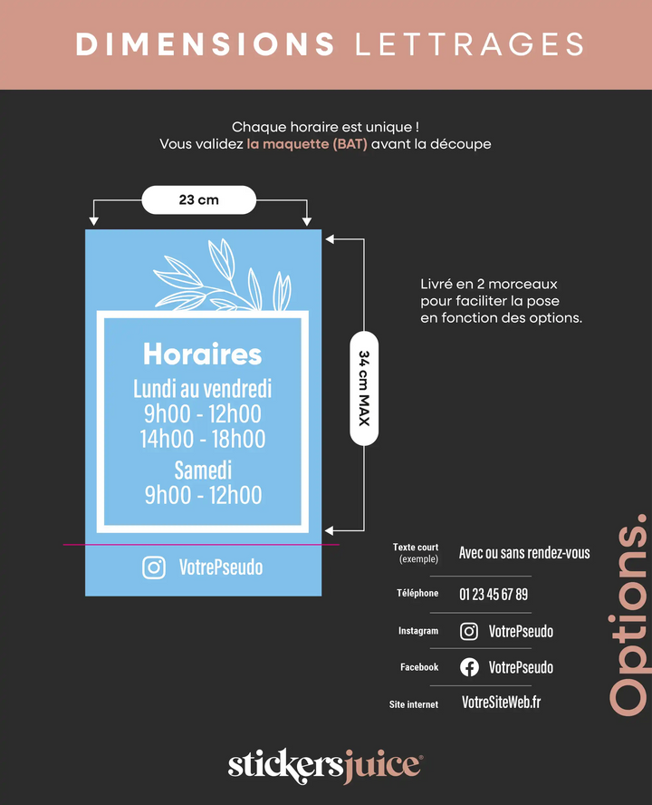 Vous êtes à la recherche d'un sticker vitrine pour afficher vos horaires de magasin de façon esthétique et originale ? Ce modèle avec son design encadré et son élément végétal, embellira la porte vitrée de votre commerce. Si vous souhaitez communiquer d'avantage d'information sur votre entreprise, retrouvez la toute la gamme de stickers Habillage.