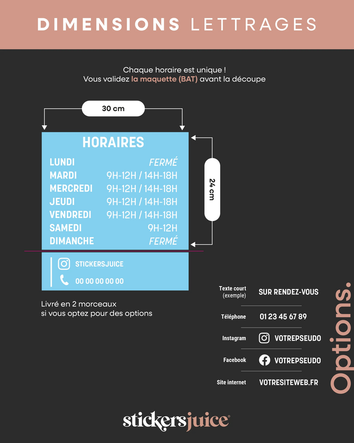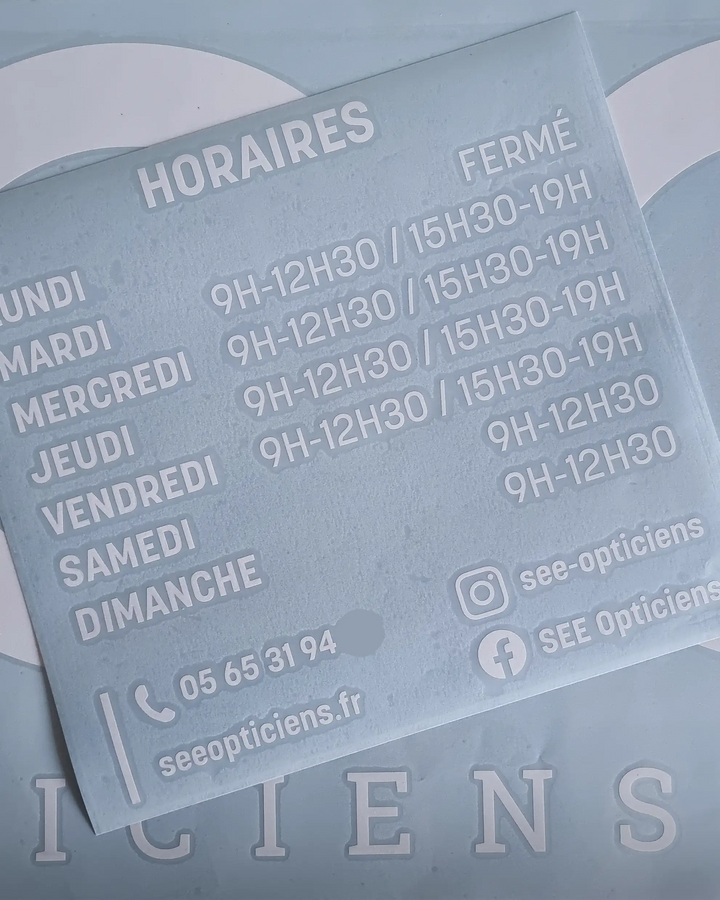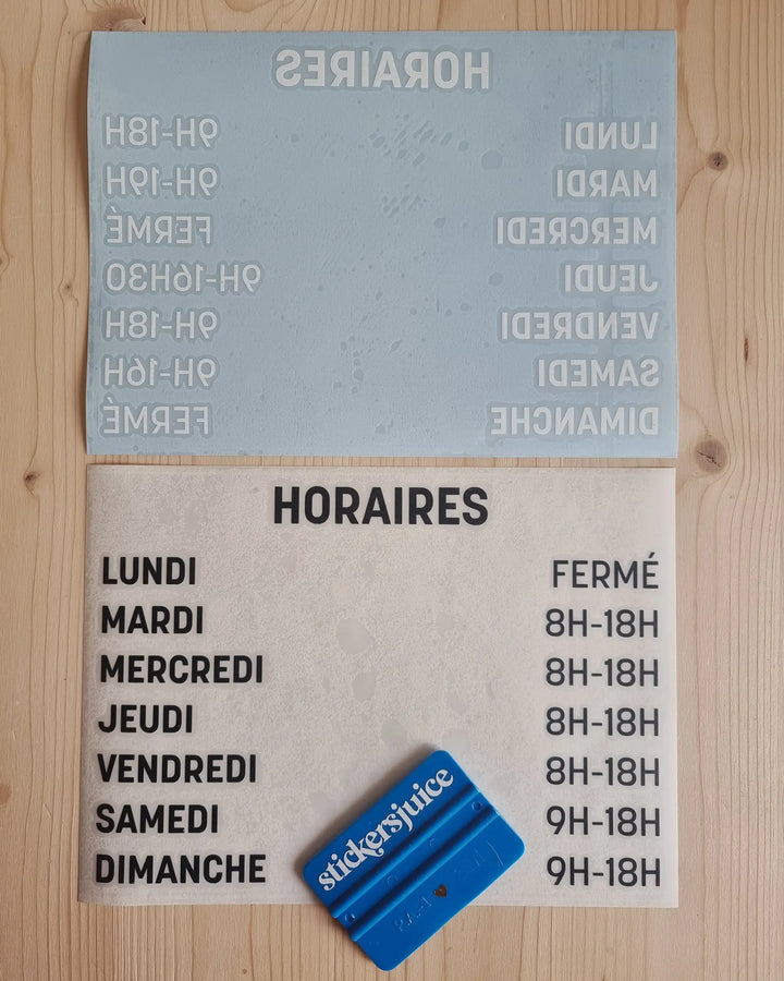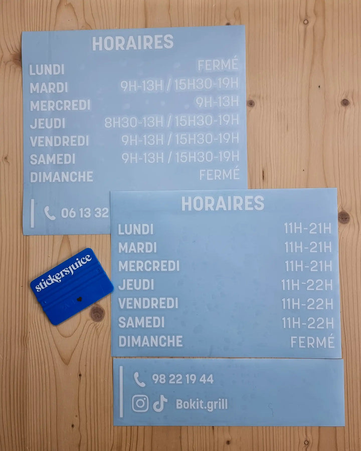 Cet autocollant horaires vitrine affiche en un coup d'œil les heures d'ouverture et de fermeture de votre établissement, pour chaque jour de la semaine. Découvrez aussi le stickers habillage tout en 1.