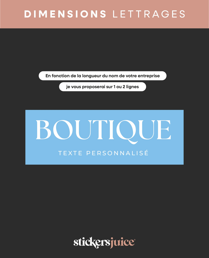 Vous n'avez pas de logo ? Optez pour ce stickers lettrages logo qui saura trouver sa place sur votre vitrine avec élégance. Personnalisez le nom de votre entreprise, ainsi que votre slogan/service. Plusieurs tailles au choix.