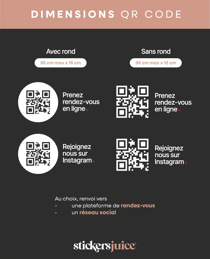 Le sticker QRC rond pour vitrine attire l’attention et offre un accès rapide à votre information au choix : la prise de rendez-vous en ligne ou à votre réseau social. Idéal pour rendre votre vitrine interactive et professionnelle en un clin d'œil ! 😃 Le petit plus ? le petit coeur rouge ❤️