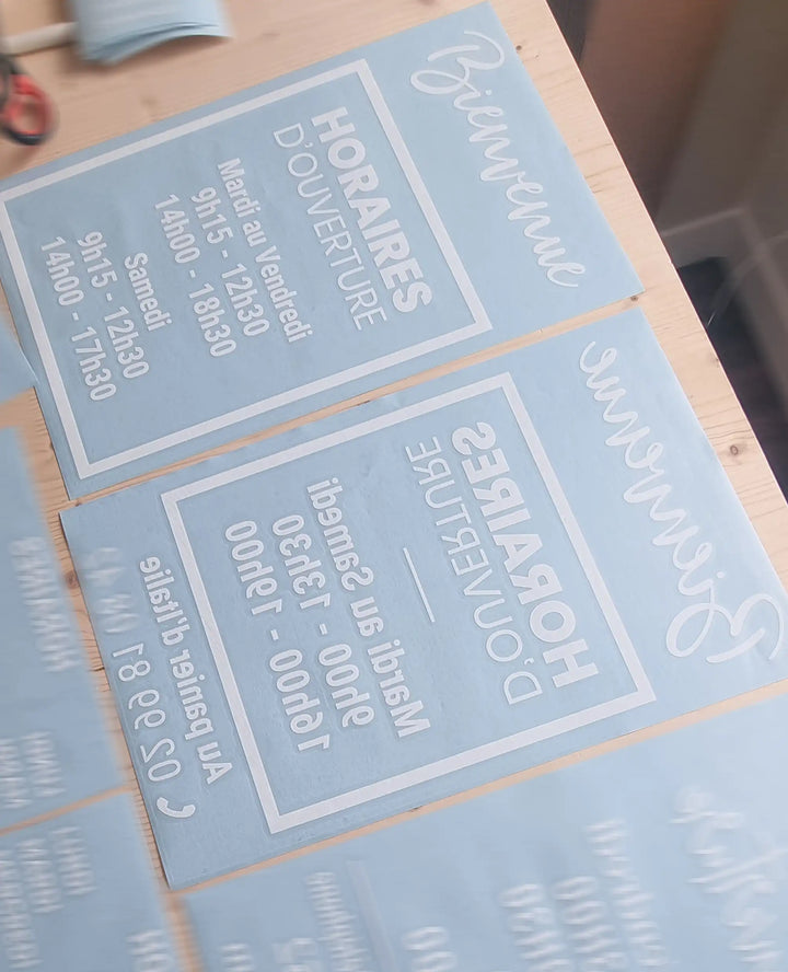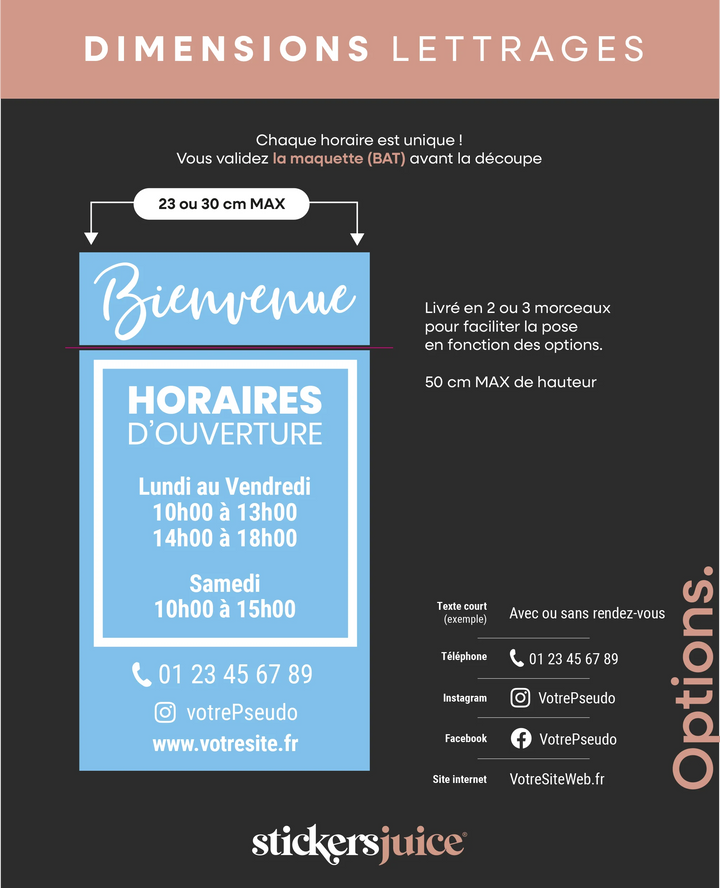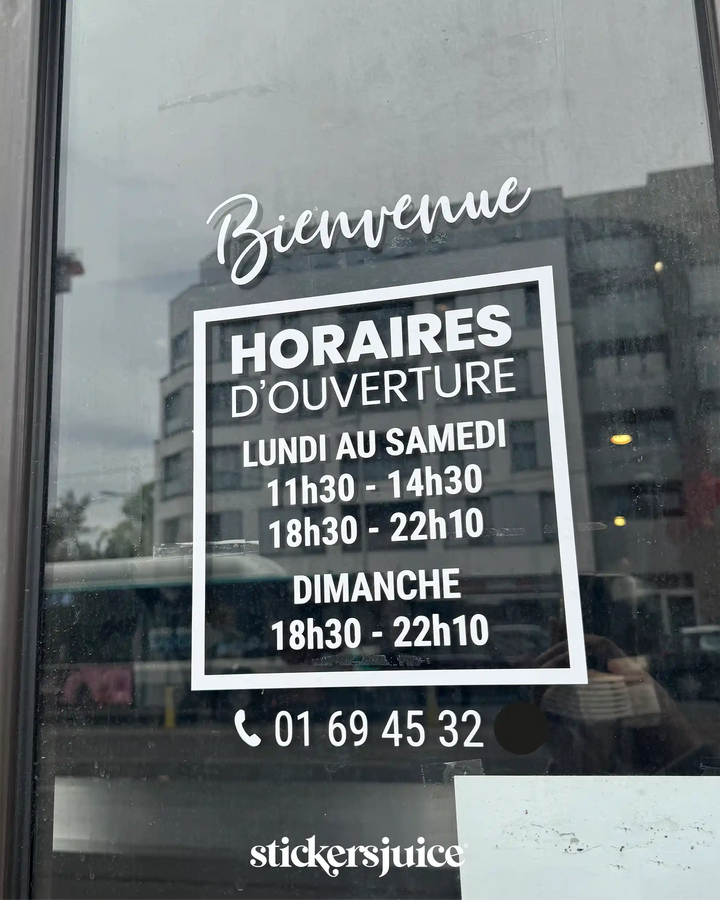 Informez passants et clients avec le sticker horaires pour vitrine personnalisé. Au design élégant et moderne, ce sticker vitrine habillera votre devanture de magasin. Avec son encadrement, l'œil sera attiré par son contenu, entre autre vos horaires magasin auxquels vous pourrez ajouter des options.